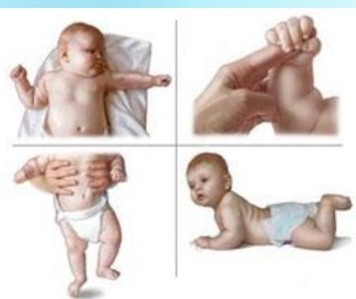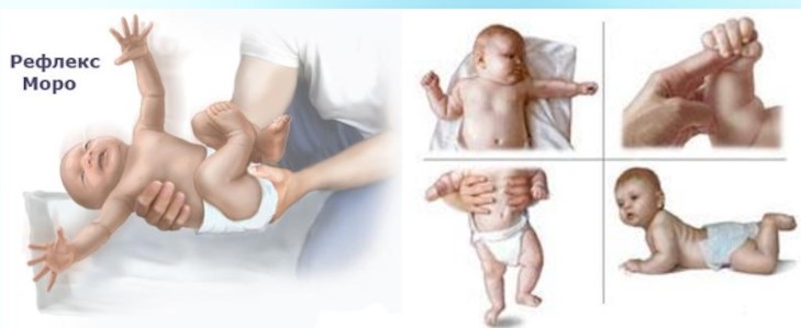 СТАРТЛ, РПС, Моро, ЛТР, защитный, рефлексы орального автоматизма, ладонно-ротовой, рефлекс Робинзона, верхний хватательный рефлекс, рефлексы Галанта и Переза, рефлекс Ландау, АШТР, СШТР, рефлекс опоры, шаговый рефлекс, нижний хватательный рефлекс, амфибия, рефлекс Бауэра, рефлексы переворачивания, ползанья по-пластунски и на четвереньках, вставания и ходьбы.